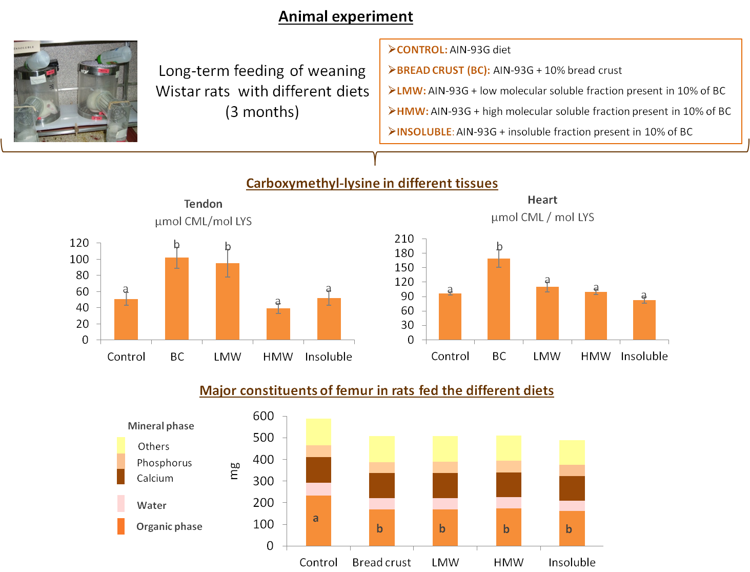 Los resultados obtenidos nos permiten establecer la siguiente conclusión: El consumo de la corteza de pan o sus fracciones, sin alterar la utilización del calcio o del fósforo, ni su destino óseo, produce cambios puntuales en la matriz del hueso, compatibles con descensos del crosslinking enzimático y aumento del no enzimático, que podrían llegar a incidir en la funcionalidad del hueso. Este resultado, unido a la acumulación de CML en algunos órganos vitales, se inscribe en el contexto de la participación de los AGEs en el desarrollo de enfermedades degenerativas.