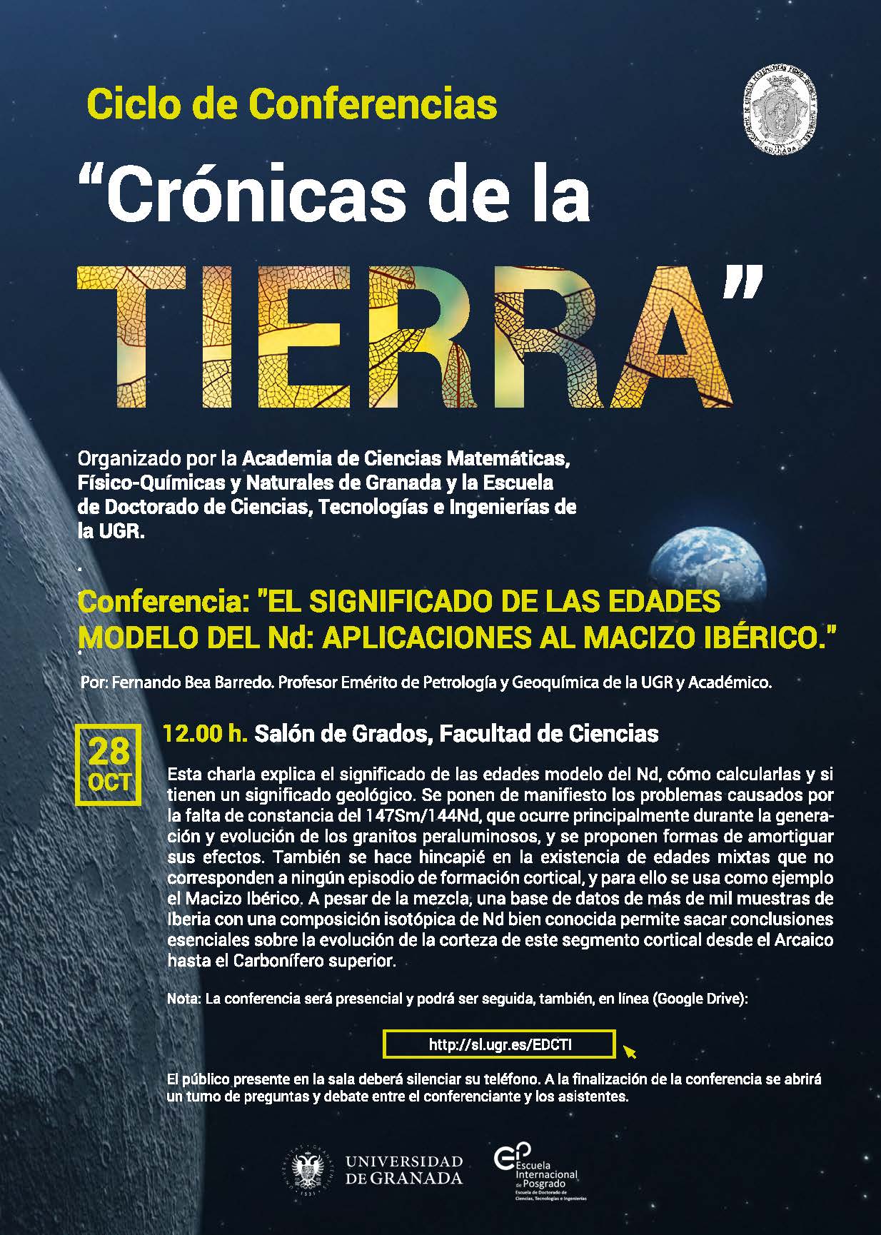 Las conferencias tendrán lugar en la Sala de Conferencias de FisyMat, en la Facultad de Ciencias de la Universidad de Granada a partir de las 12 horas.