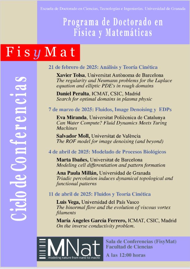 El Programa de Doctorado en Física y Matemáticas (FisyMat) - (https://www.ugr.es/~fisymat/doctorado/) - y la Escuela de Doctorado en Ciencias, Tecnologías e Ingenierías de la Universidad de Granada, en colaboración con la unidad de investigación Modeling Nature (MNat) - (https://www.modelingnature.org/) , organiza un ciclo de conferencias sobre recientes avances en modelización matemática, con la participación, entre otros, de tres Premios Nacionales de Investigación y 5 receptores de ERC Advanced Grants.