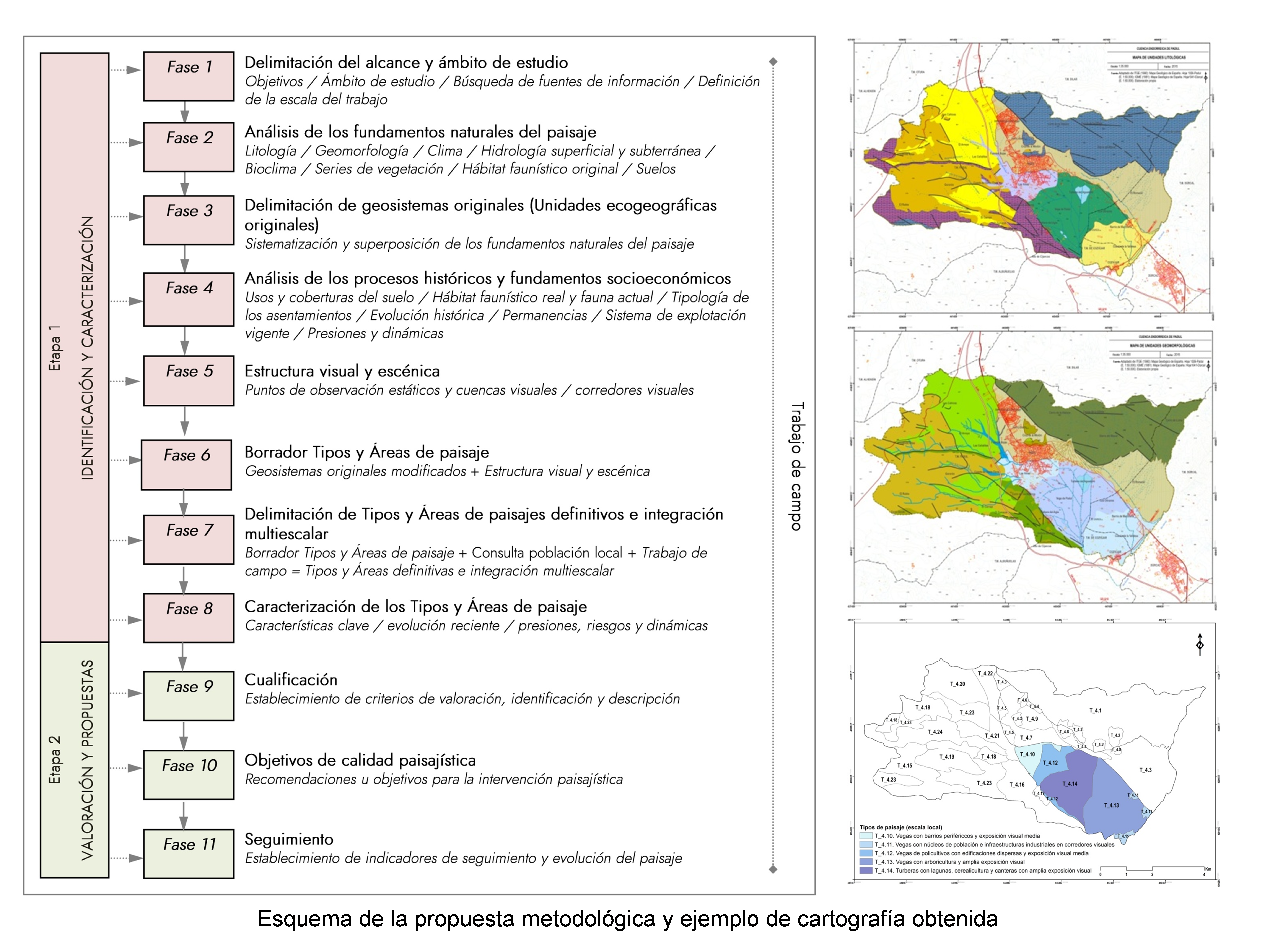 La metodología consta de dos etapas: identificación y caracterización; y valoración y propuestas. La primera etapa consiste en la delimitación de unidades de paisaje y su clasificación en Tipos y Áreas de acuerdo con la exitosa metodología británica LCA (Landscape Character Assessment); caracterización e integración multiescalar. La segunda etapa tiene como objetivo establecer una valoración y significación de estos paisajes a partir de su cualificación y establecimiento de objetivos de calidad paisajística.
