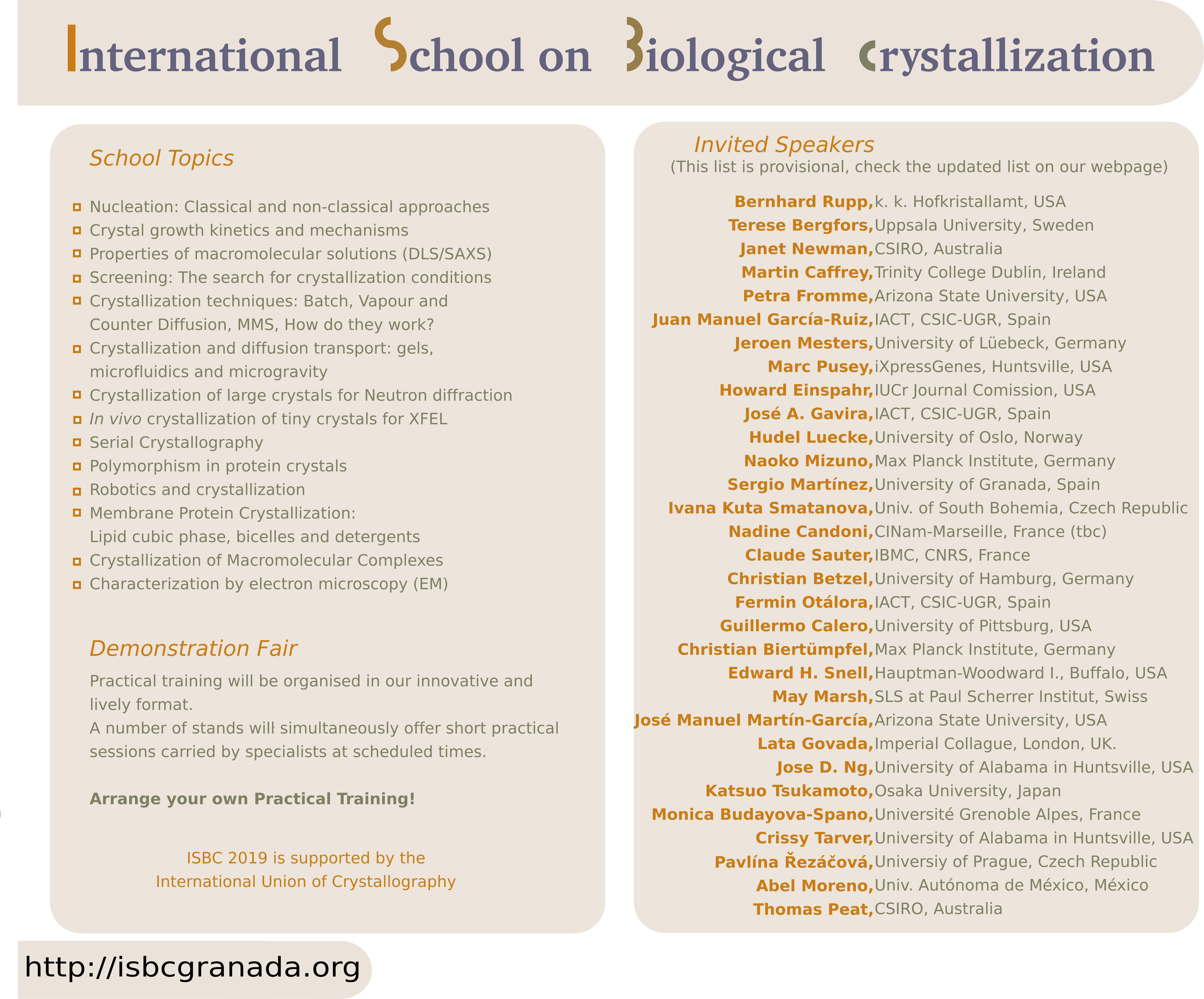 The whole series of ISBC and ISC are sponsored by the International Union of Crystallography (IUCr), The Spanish Ministry of Economy, Industry and Competitiveness, The University of Granada, The Specialized Group of Crystallography and Crystal Growth (GE3C) of the Spanish Royal Society of Chemistry and the Excellence Network or Crystallography and Crystallization “Factoria de Cristalización”.
