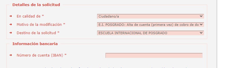 • NO han percibido anteriormente ninguna retribución de la Universidad de Granada por cualquier concepto o desean modificar la cuenta bancaria en la que percibir la retribución: