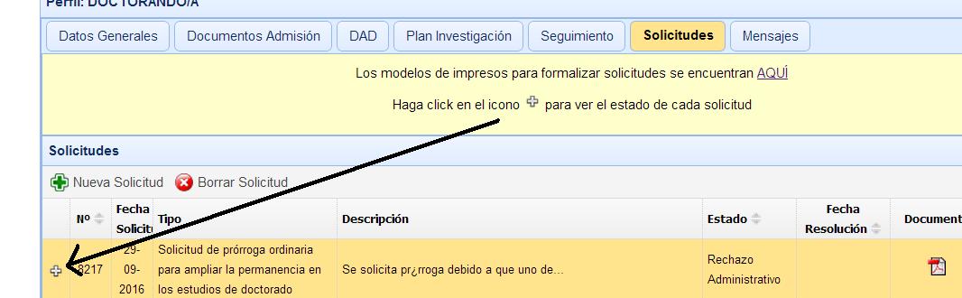 Once the appropriate administrative decision has been received, it will be attached to your request with the legend “Aceptada” (Accepted) or “Rechazada” (Rejected), the reasons for which can also be consulted as shown in the previous image. Additionally, you will be sent an email (always to your @correo.ugr.es email address) with the administrative decision. Doctoral students whose requests have been rejected will receive a notification through the UGR e-Administration Platform.