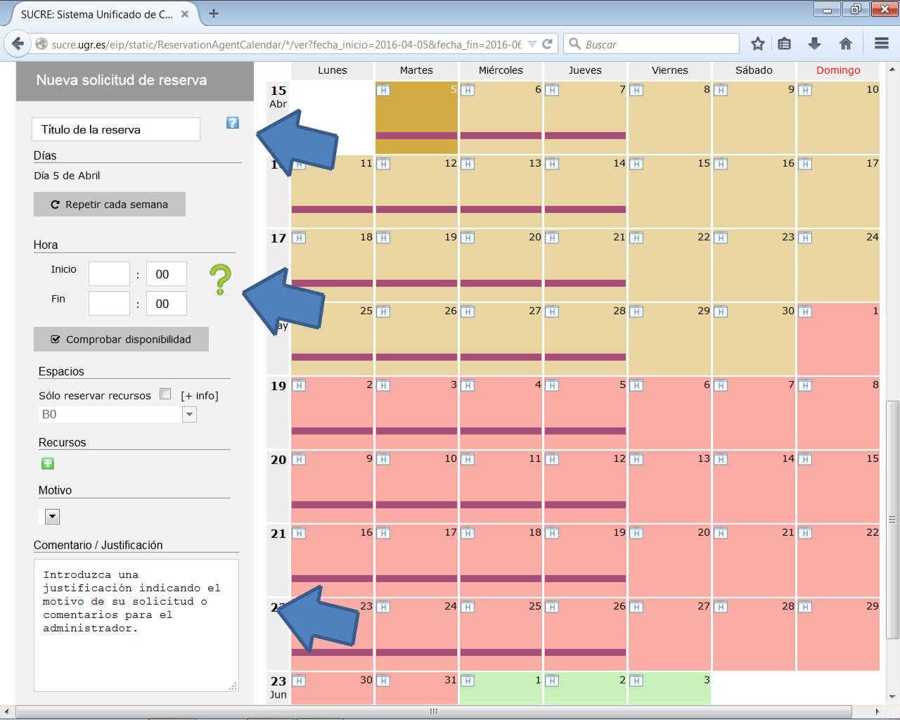 Deberán rellenarse los apartados siguientes: título, hora de inicio y fin de la actividad y motivo de la reserva: