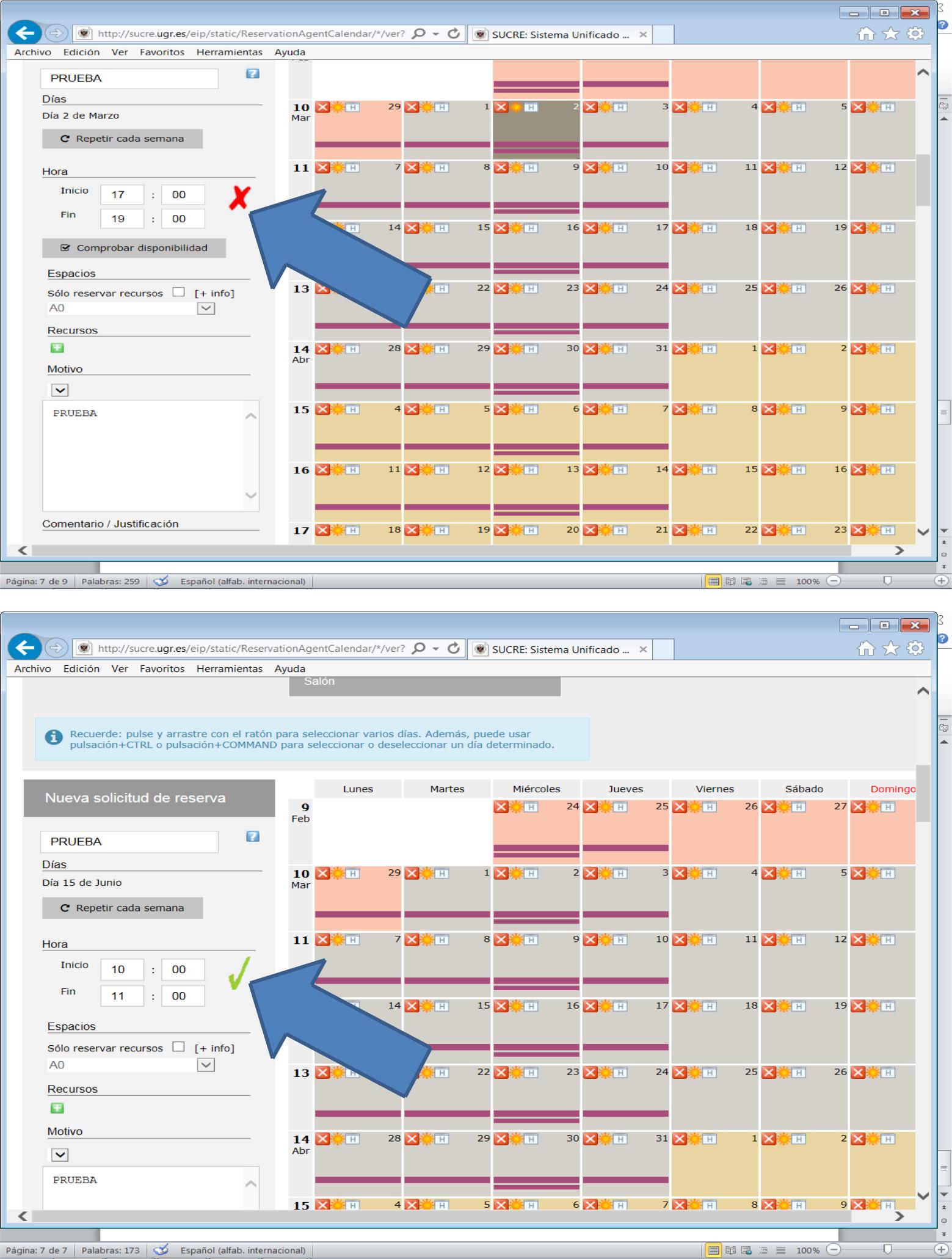 Si el sistema comprueba que existe disponibilidad aparecerá una “V” en color verde junto a las horas seleccionadas, mientras que si no existe esa disponibilidad, aparecerá una “X” roja para indicar que no puede hacerse la reserva: