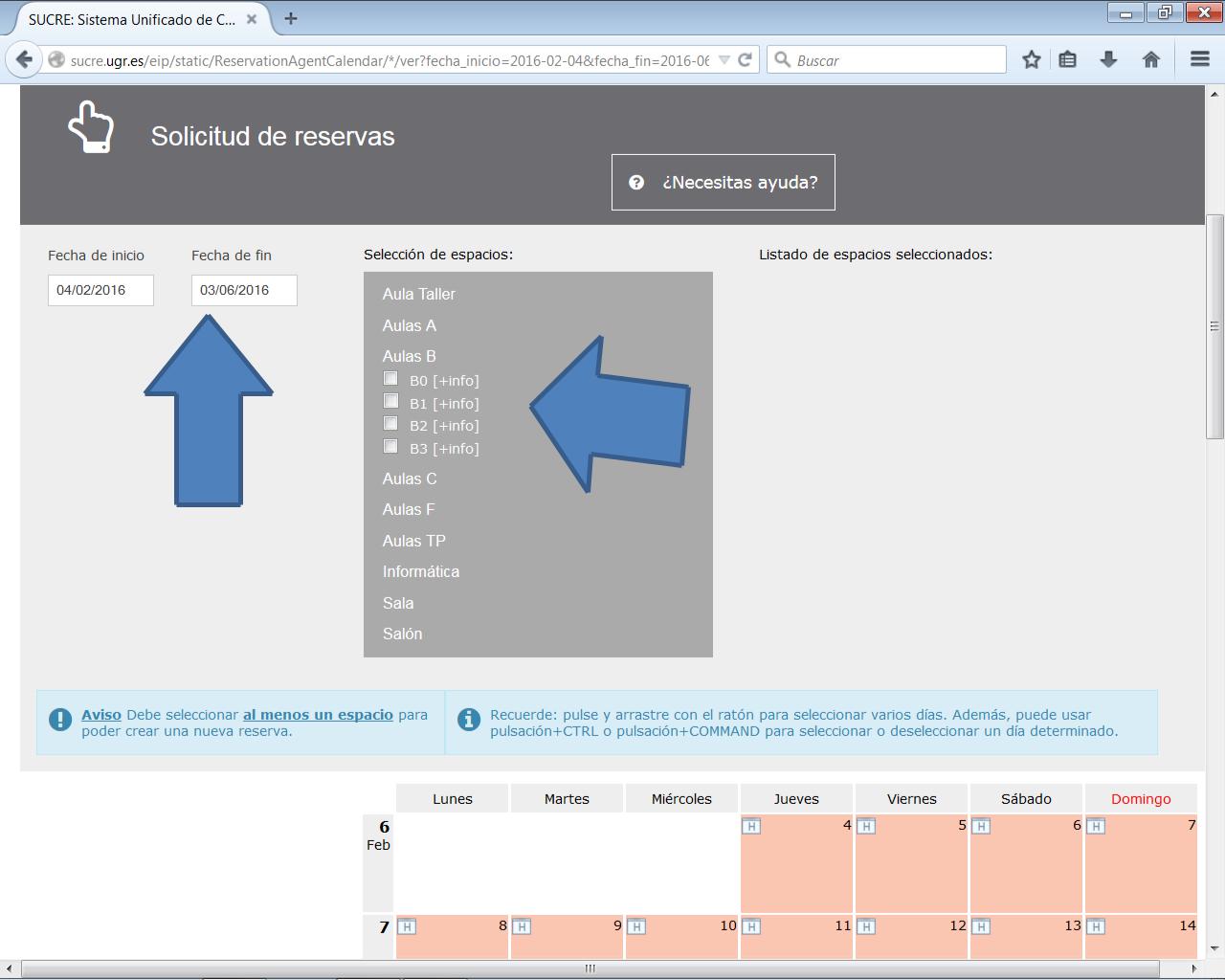 En esta pantalla podrá seleccionar la fecha que se quiere consultar o reservar y el espacio disponible.